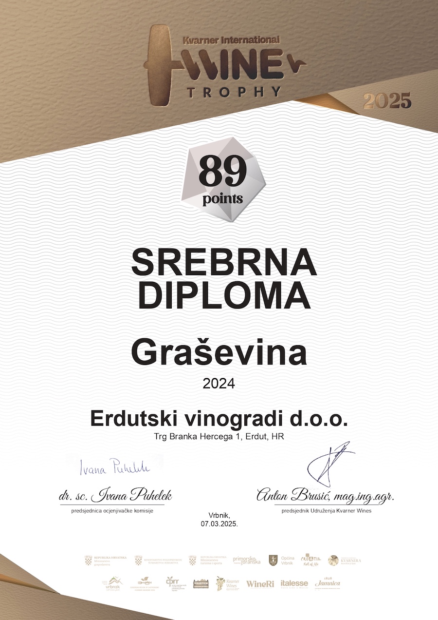 Nova potvrda izvrsnosti za Graševinu, Graševinu New Line, Traminac, Chardonnay i Crveni Cuvee Vina Erdut! Enolozi, sommelieri i vinski novinari s međunarodnim iskustvom, kao i certificirani ocjenjivači Hrvatske agencije za poljoprivredu i hranu, okupili su se u Vrbniku na otoku Krku s ciljem rangiranja vina međunarodnih i autohtonih hrvatskih sorti vinove loze. Riječ je o Kvarner International Wine Trophyju, u okviru kojega je čak pet vina marke Vina Erdut zavrijedilo drugo mjesto, odnosno srebrnu diplomu u kategoriji najbolje ocijenjenih vina regije Slavonija i hrvatsko Podunavlje.
